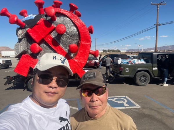 对于这次游行车队的规模,邢鉴目测,出发的时候有20多辆车,有一辆车拖着中共病毒的雕塑。车上挂着旗,挂着“COVID19 Made in CCP”(新冠病毒中共制造)、“CCP get out of America”(中共滚出美国)等标语。车队还带了两辆房车,休息时一部分人睡在房车里面,有部分人就睡在自己车里面,还有露营的。