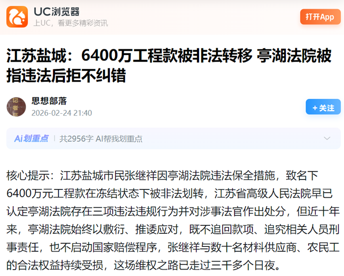 江苏盐城:6400万工程款被非法转移 亭湖法院被指违法后拒不纠错