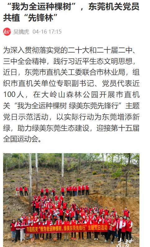 4月16日,南方+发表了《“我为全运种棵树”,东莞机关党员共植“先锋林”》:植树现场,市林业局技术人员首先开展“七步种树法”的教学讲解。机关党员身着红色志愿马甲,挥锹铲土、扶正树苗、培土围堰。