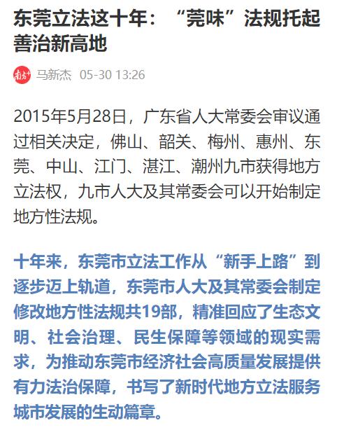 南方+在5月30日发表的《东莞立法这十年:“莞味”法规托起善治新高地》指出:十年来,东莞市立法工作从“新手上路”到逐步迈上轨道,东莞市人大及其常委会制定修改地方性法规共19部,精准回应了生态文明、社会治理、民生保障等领域的现实需求,为推动东莞市经济社会高质量发展提供有力法治保障,书写了新时代地方立法服务城市发展的生动篇章。