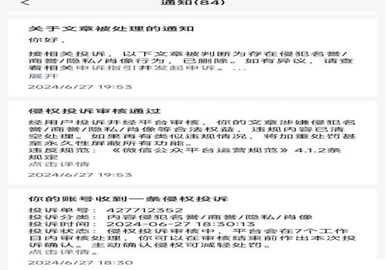 在19:53,微信公众号即发来通知,确认“你的内容经查涉嫌内容侵犯名誉/隐私/肖像,已被删除”。