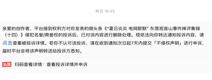 除了撰稿人的帖子被南方电网东莞市供电局删除外,也有其他媒体人的今日头条帖子《“夏日炎炎电网默默”东莞观音山事件辣评集锦(十四)》被同样理由删除。