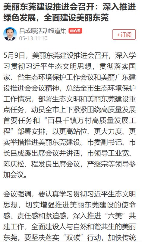5月13日,南方+发表了《美丽东莞建设推进会召开:深入推进绿色发展,全面建设美丽东莞》中说:切实增强推进美丽东莞建设的使命感、责任感和紧迫感,深入推进“六美”共建工作,全面建设人与自然和谐共生的美丽东莞。要坚持扩绿、兴绿、护绿并举,深入推进绿美东莞生态建设。要坚持多元共治,创新智慧监管和执法,不断完善绿色发展激励机制,持续强化社会多方参与,进一步健全生态环境治理体系。