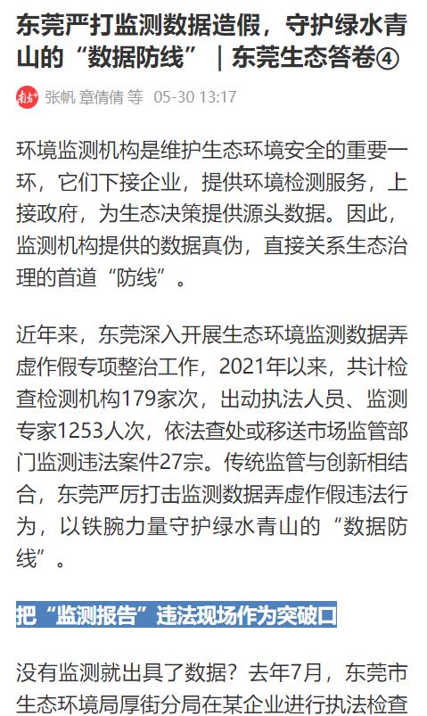 5月30日,南方+发表《东莞严打监测数据造假,守护绿水青山的“数据防线”|东莞生态答卷》文末指出:维护生态“数据防线”,社会公众有参与权和监督权。东莞市生态环境局于2023年4月14日印发了《关于开展东莞市生态环境领域第三方监测服务机构专项整治工作的公告》,结合《东莞市环境违法行为有奖举报办法》,面向全社会各界群众征集环境监测数据弄虚作假违法线索。发现一起,查处一起,只有对监测数据弄虚作假等环境违法行为“零容忍”,方能真正实现一片“真”蓝天。