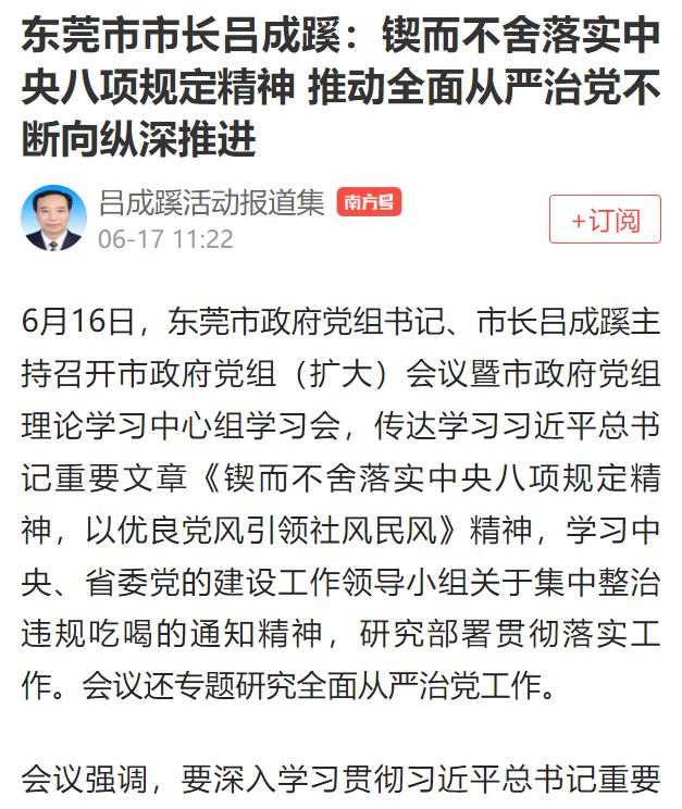 6月17日,南方+发布《东莞市市长吕成蹊:锲而不舍落实中央八项规定精神 推动全面从严治党不断向纵深推进》:会上强调要深入学习贯彻习近平总书记重要讲话和重要指示精神以及中央、省委有关通知精神,持之以恒抓好全市政府系统作风建设,锲而不舍落实中央八项规定精神,以实际行动坚定拥护“两个确立”、坚决做到“两个维护”.....要以身作则,形成一级抓一级、层层抓落实的工作格局,共同营造风清气正的政治生态。