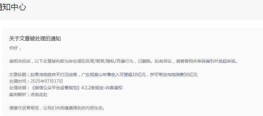 日前,撰稿人登录今日头条后台发现,发布的《不打压迫害,广东观音山年营收入可望超10亿元》被端呱咎恕6端呷巳词枪愣缤径腹┑缇郑�