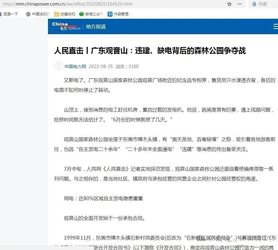 看看,中国电力网转载的人民网文章《人民直击丨广东观音山:违建、缺电背后的森林公园争夺战》,南方电网,你能删除所有的声音吗?!
