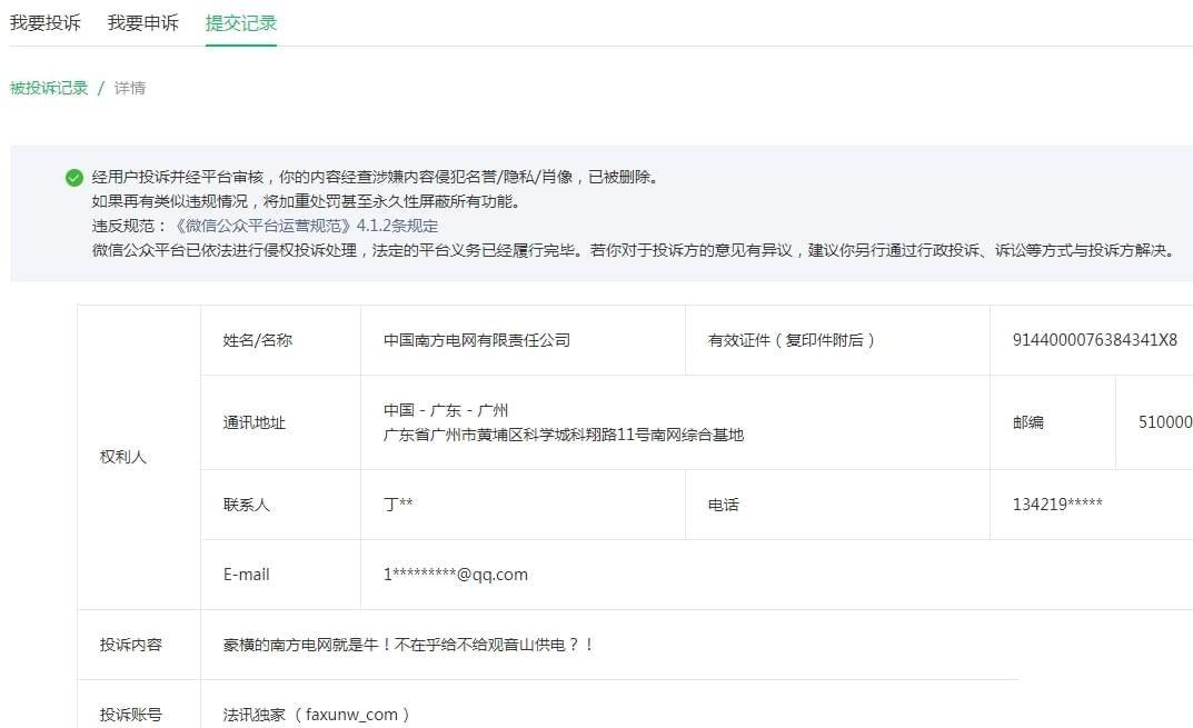 网易号“法询独家”发布的《终于知道南方电网为什么不给观音山供电了!》在展现803次后没有通知,直接下线!