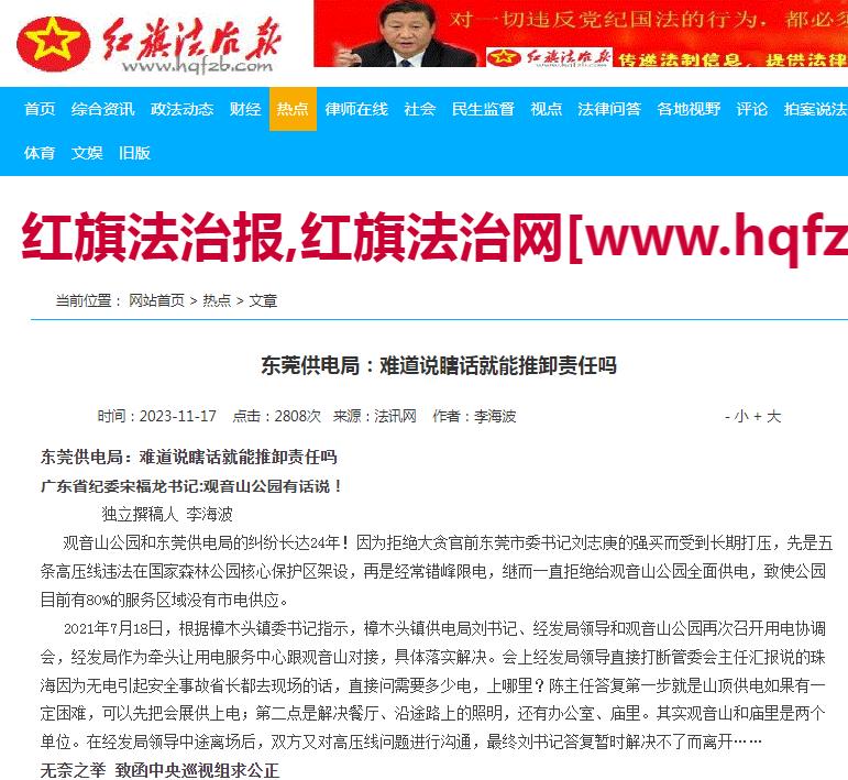2023年5月19日,广东观音山公园向中央巡视组提交了题为《南方电网对东莞民企的伤害有多深?社会影响有多坏?》的情况反映材料。之后东莞供电局进行了不实回复,观音山公园于11月1日给广东省纪委递交了书面材料《关于东莞供电局2023年10月7日不实回复及推卸责任的情况反映》,指明:1.东莞供电局拒绝给观音山供电的理由是观音山不是产权单位及以违章建筑为由不予办理增容和供电的情况回复是不实回复。东莞供电局的这一理由是不能成立的。2009年5月11日,观音山公司与东莞樟木头供电局公司签订供电合同。供电合同第1.1条约定用电地是“樟木头石新社区观音山森林公园”,用电性质:永久性。用电地域范围是“樟木头石新社区观音山森林公园”。合同约定的供电范围是“观音山森林公园“按照此合合同约定东莞供电局必须为整个观音山森林公园供电。但观音山森林公园至今仍有80%的区域没有供电。观音山十多年以来多次向供电局申请供电,东莞供电局却以产权为由拒绝供电。2.东莞供电局对观音山旁边的一百多座村民违章建筑供电,但对观音山森林公园内80%的区域却不予供电。两种不同的做法,有失公允。3.关于东莞供电局对观音山的增容、观音寺等新装业务不予通电的情况回复与事实不符:观音山目前可用电总功率为630千瓦,分别由两台变压器供电,两台变压器目前均能正常使用,但是在办理新装变压器增容的过程中,东莞供电局却拒绝办理,其理由是: 1.观音山不是产权人,办理用电需报社区的同意并盖章。2、会展中心(报装区城)属于违章建筑,经政府的两遗办同意并盖章后,由樟木头人民政府办理申报。供电局的这两个理由已经违反了《民法典》第648条、《电力法》第26条的规定。所谓“违建”只是东莞供电部门为了不给观音山森林公园通电的一个说辞面已。其目的是为了隐瞒事实,欺骗上级主管部门和社会公众。