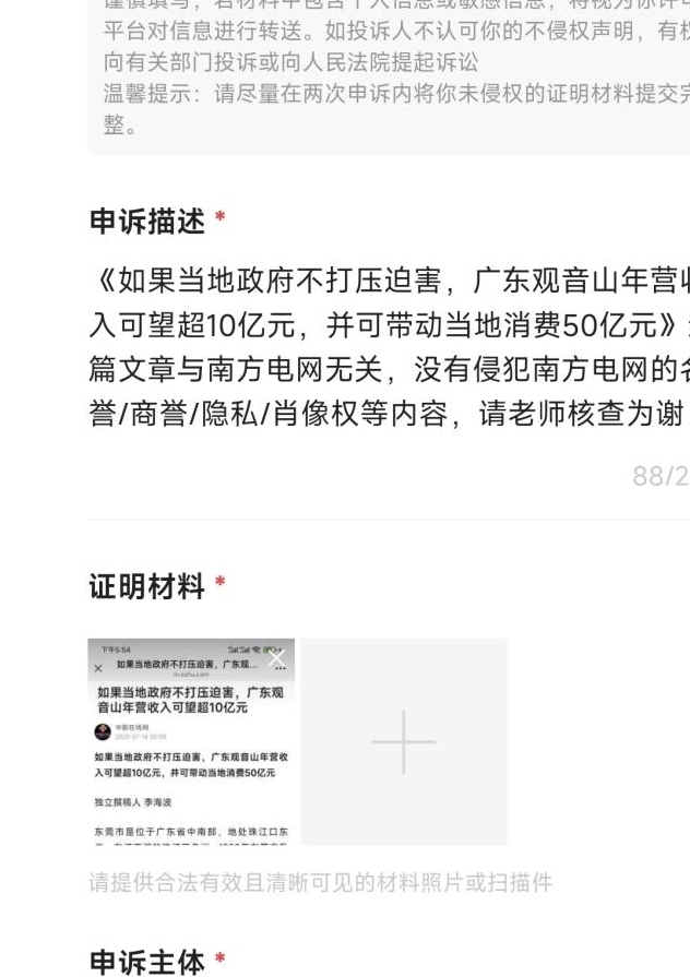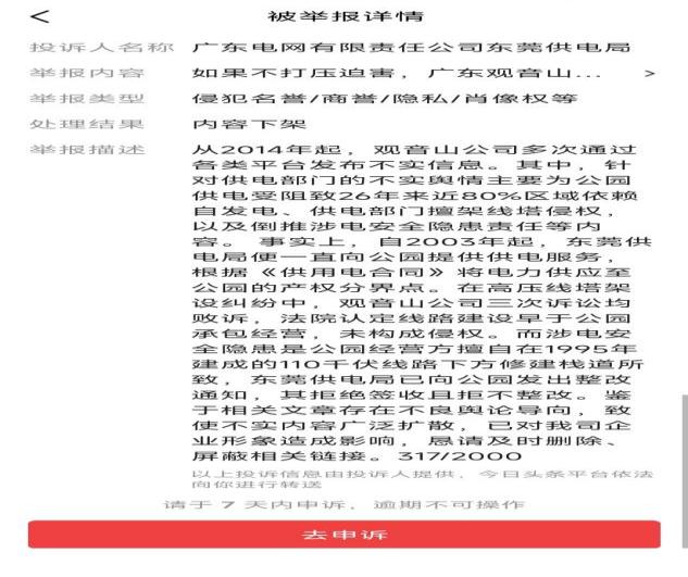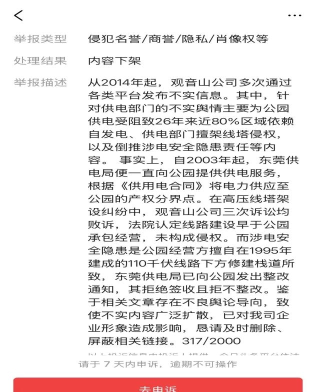 东莞供电局的举报描述是:“从2014年起,观音山公司多次通过各类平台发布不实信息。其中,针对供电部门的不实舆情主要为公园供电受阻致26年来近80%区域依赖自发电、供电部门擅架线塔侵权,以及倒推涉电安全隐患责任等内容。事实上,自2003年起,东莞供电局便一直向公园提供供电服务。根据《供用电合同》将电力供应至公园的产权分界点。在高压线塔架设纠纷中,观音山公司三次诉讼均败诉,法院认定线路建设早于公四承包经营,未构成侵权。而涉电安全隐患是公园经营方擅自在1995年建成的110千伏线路下方修建栈道所致,东莞供电局已向公园发出整改通知,其拒绝签收且拒不整改,鉴于相关文章存在不良舆论导向,致使不实内容广泛扩散,已对我司企业形象造成影响,恳请及时删除、屏蔽相关链接。”