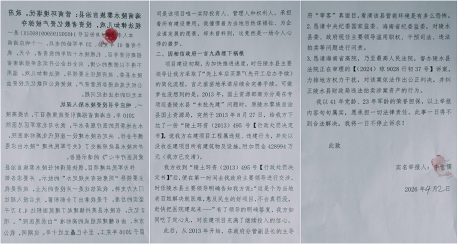 本人李世儒(身份证号14020219590918951X)是一个有着41年党龄、23年军龄的老兵,一个响应海南招商引资号召、扎根陵水十四年的投资者。今天,我不得不以愤懑的心情,向全社会公开实名举...更多